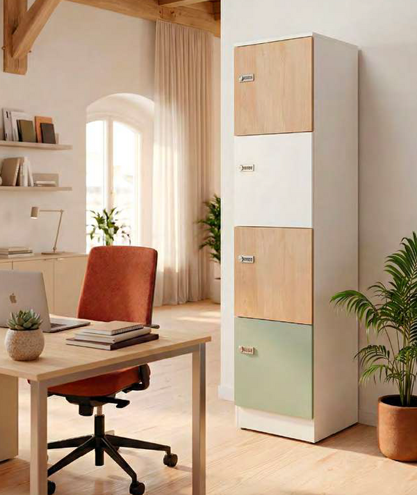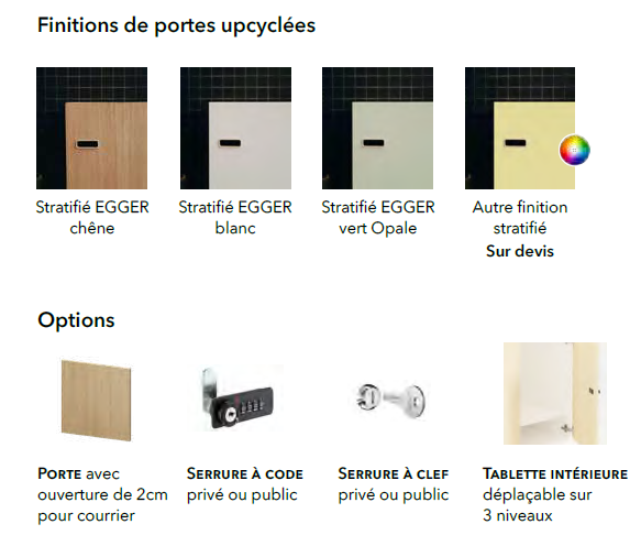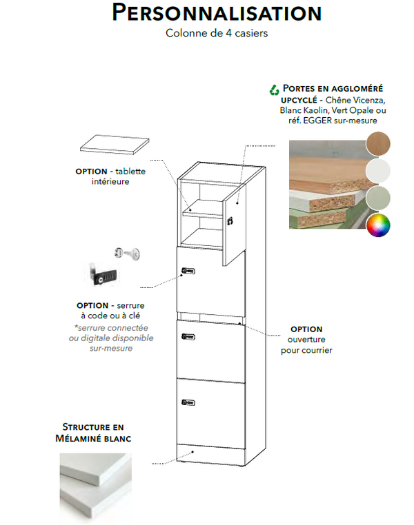 Une colonne de 4 casiers de 45x45cm pensée et fabriquée à partir de matériaux recyclables, recyclés et upcyclés.