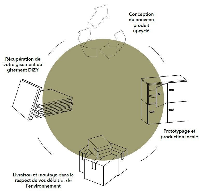 Dans une démarche d'économie circulaire, nous mettons l'upcycling, ou 'surcyclage' en français, au cœur de notre processus. En effet, plus de 80% du mobilier est fait à partir de panneaux de bois. Pour éviter de 'jeter' cette matière en fin de vie d'un produit, nous avons mis au point un processus de collecte et transformation de cette matière bois usagée pour lui donner une seconde vie. Un processus unique qui s'inscit à 100% dans le cadre de la loi AGEC et de la décarbonation de vos espaces de travail !